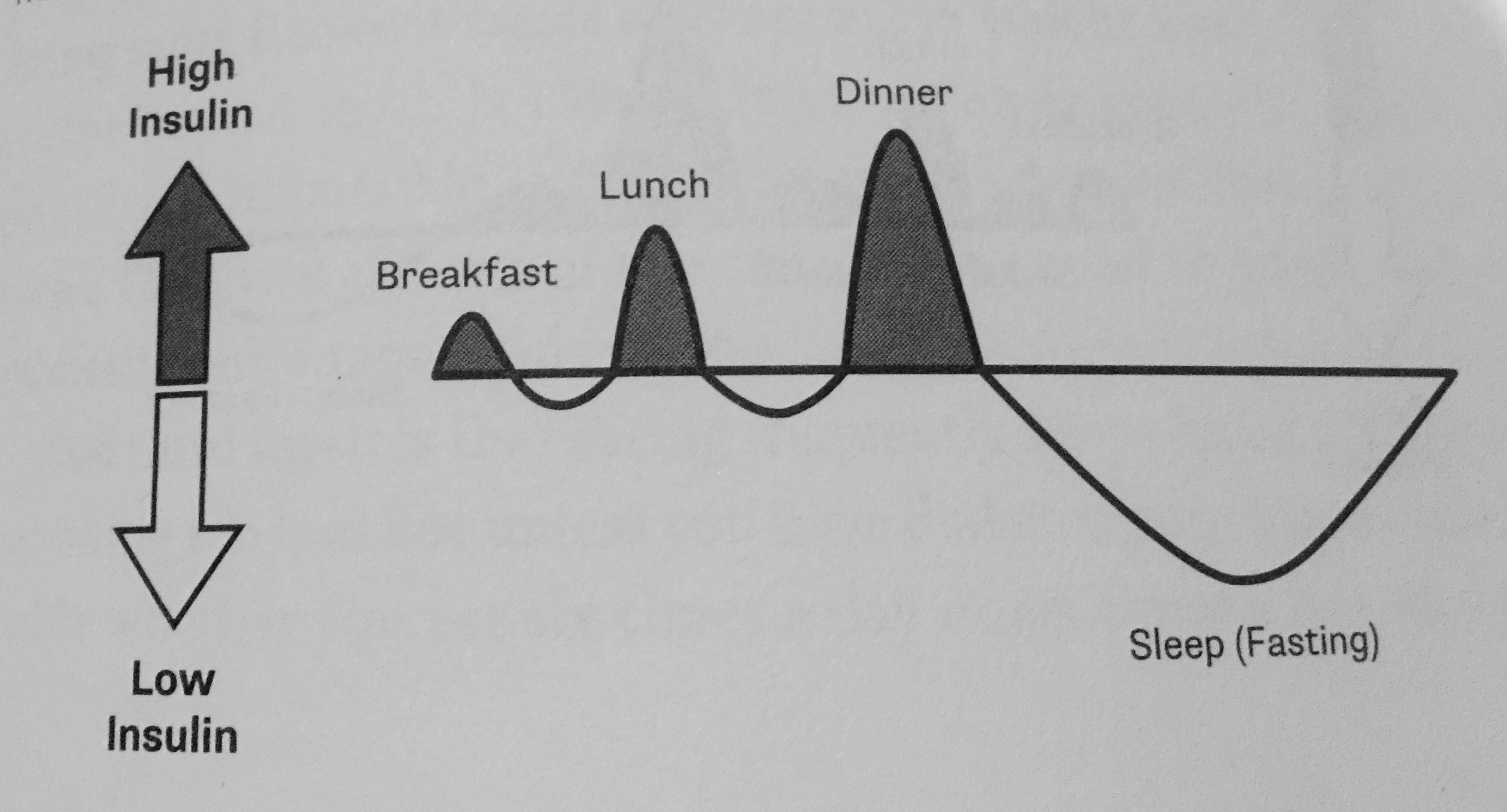 Here are some graphics that I borrowed from Dr. Jason Fung’s book The Obesity Codepublished just this year (2016). These graphs illustrate an example of insulin release over the course of an average day: