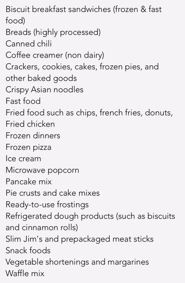 If you already eat a healthy diet of whole foods, you likely avoid prepackaged and processed foods already. In case you don’t, here are some products that may have industrial trans fats: