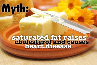 This is a myth. Saturated fat raises HDL (which some call the “good”) cholesterol, and changes LDL particles from small and dense to large, buoyant (benign) LDL particles, which does not increase the risk of heart disease. This has been intensively studied in the past few decades, and studies consistently show that saturated fat, as well as dietary cholesterol, are not contributers to risk for coronary heart disease.