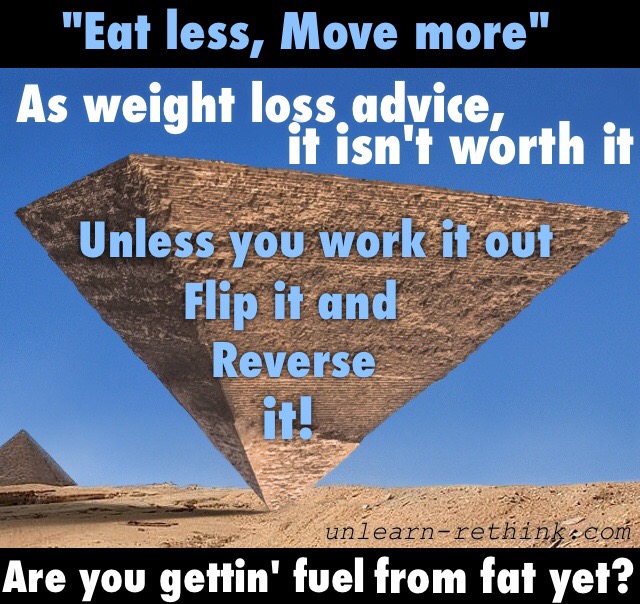 Not only is this common adage laughingly simplistic and misguided, but it is ill-conceived. “Eat less, move more” should never be recommended as a method for weight loss, but rather, recognized as the result of a well executed lifestyle change.