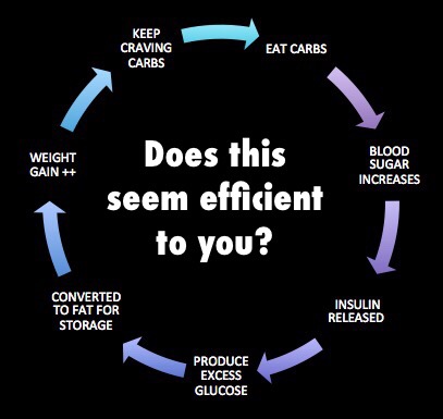 When your diet consists of predominately carbohydrates, a vicious cycle begins. The glucose from carb consumption will quickly set this cycle in motion, as glucose is a very short-lived fuel. The presence of glucose will trigger several hormones into action, and deliver a dopamine reaction to the pleasure centers of your brain. The hormone insulin is released in an effort to lower your blood sugar. Some of the glucose will be used to fuel your body, but the excess will be stored away in your fat cells. This happens relatively quickly and as your blood glucose levels plummet, the hormone ghrelin is released to tell you that you are hungry again. Leptin, the hormone that would normally trigger a feeling of satisfaction and communicate to your body that you are full, is stifled in the presence of excess carbohydrates. Thus, setting in motion a vicious cycle, the broad strokes of which are illustrated here: