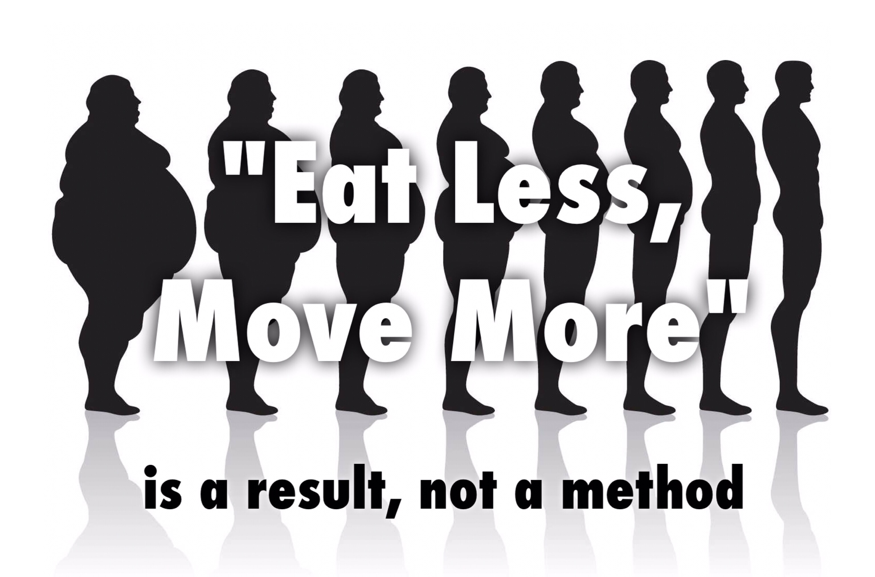 Not only is this common adage laughingly simplistic and misguided, but it is ill-conceived. “Eat less, move more” should never be recommended as a method for weight loss, but rather, recognized as the result of a well executed lifestyle change.